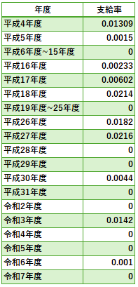 下表は年ごとの付加退職金支給率である。